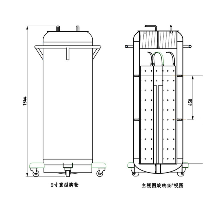 容器內已經添加了支撐結構,以增強運輸耐性。容器采用高真空、多層絕熱結構的形式,真空層中設有吸附劑,能夠長期保持真空度。容器蓋由帽蓋和芯塞構成,芯塞采用絕緣性能優(yōu)良的硬質發(fā)泡塑料制成,不僅可降低液氮蒸發(fā)量,還能固定提筒。為了減少液氮在容器工作狀態(tài)中的蒸發(fā),提筒采用不銹鋼制造。提筒的提桿和桿筒組件之間采用玻璃纖維增強塑料細管連接,以提高絕緣性能。液氮罐上部安裝有定位環(huán),提筒可通過定位環(huán)上的槽和內膽底部的凸起以及芯塞而固定,使得工作狀態(tài)更加穩(wěn)定,安全地進行搬運和長途運輸。